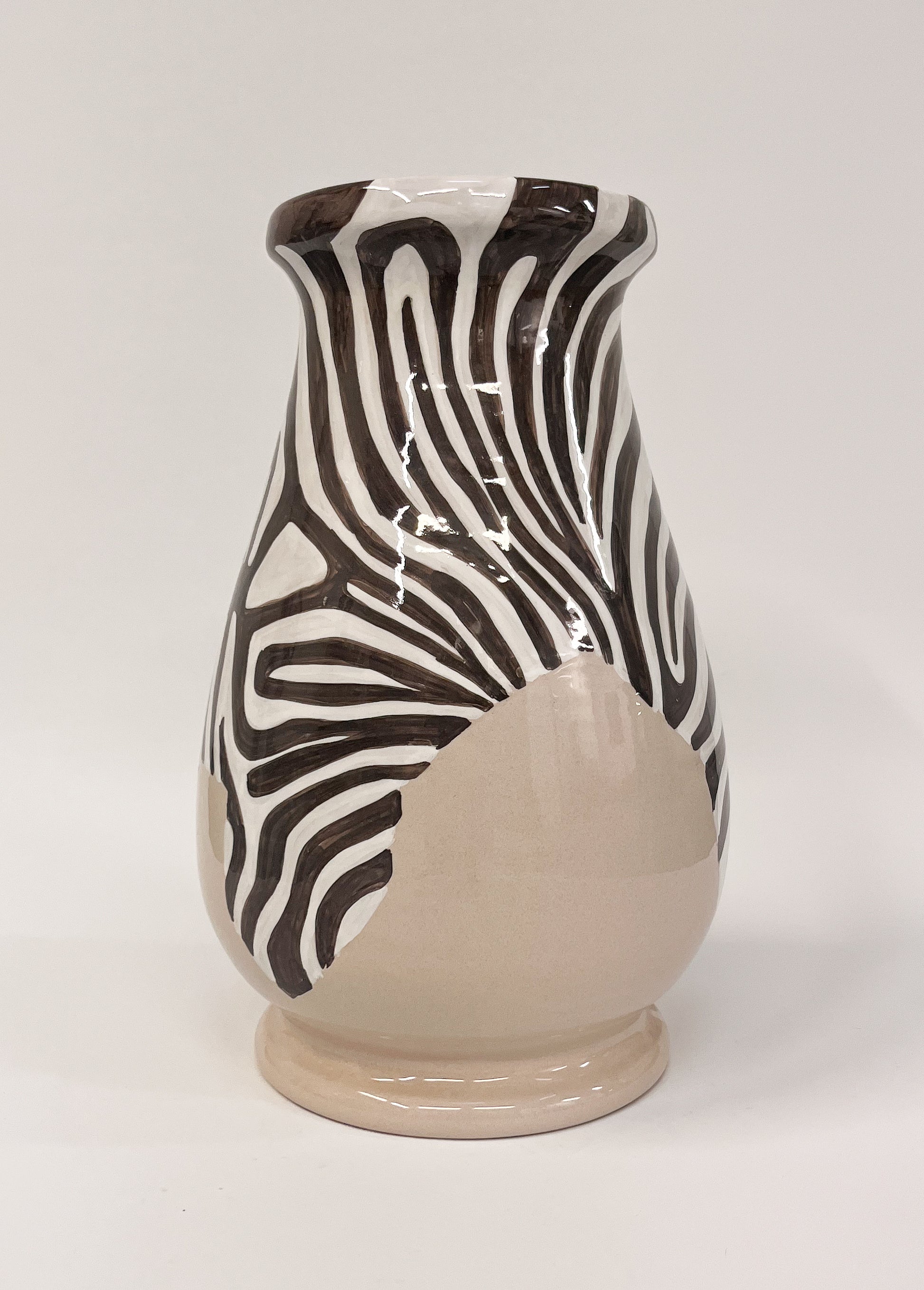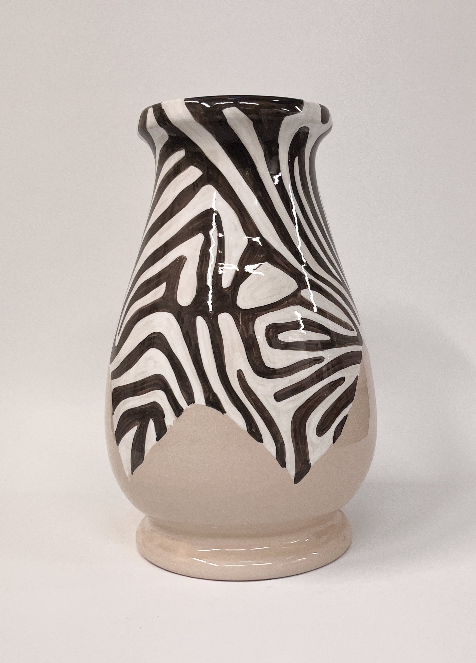 Käsin valmistettu keraaminen maljakko, jossa käsinmaalattu zebra‑kuvio kohtaa lämpimän, kiiltävän pohjasävyn. Jokainen raita on maalattu Derutan mestareiden perinteitä kunnioittaen, mikä tekee jokaisesta kappaleesta uniikin.