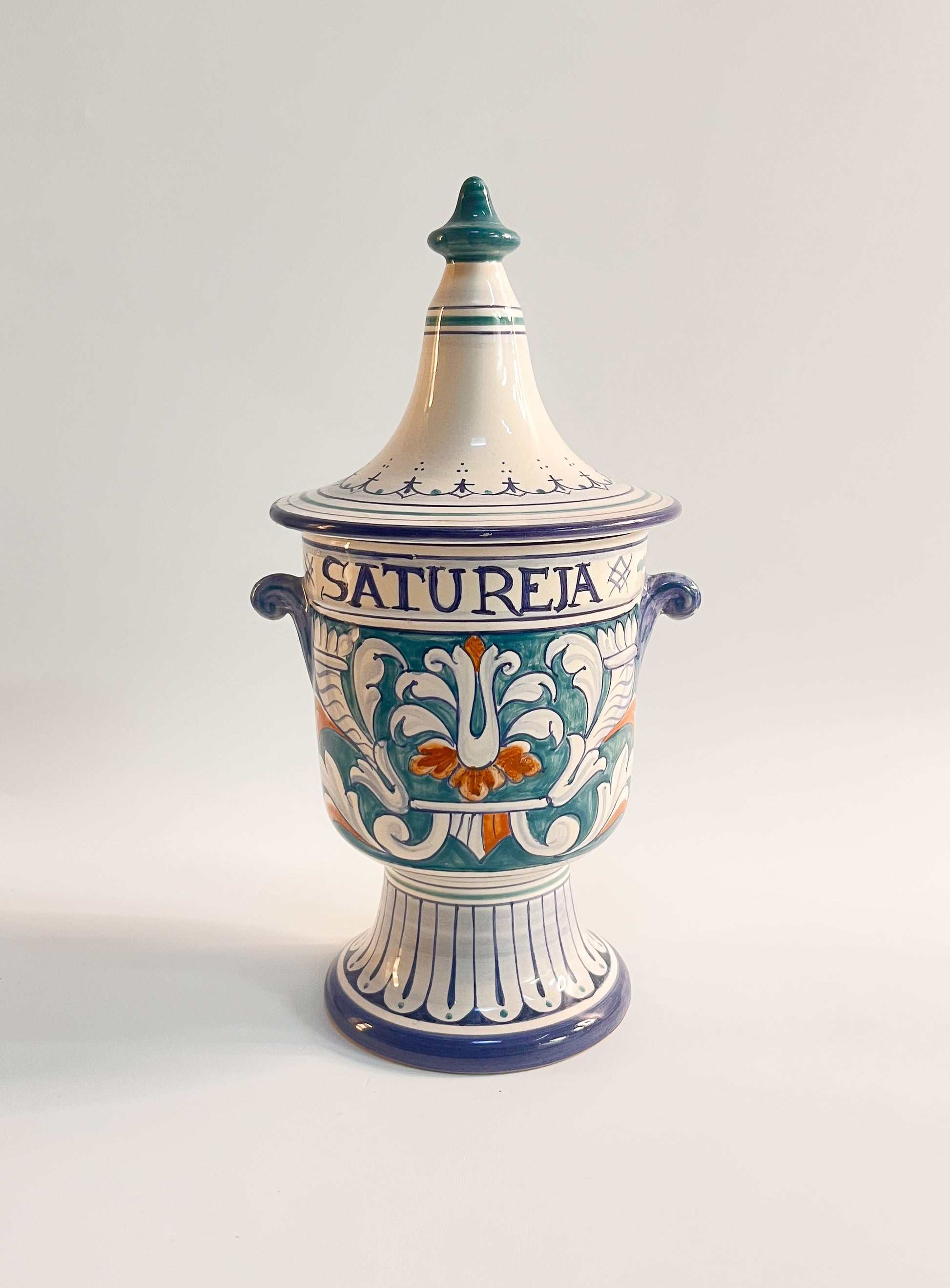 Etupuolen “Satureja” viittaa perinteiseen rohdoskasviin ja antaa purkille autenttisen, historiallisen luonteen. Näyttävä taide-esine, joka tuo sisustukseen väriä, kulttuurista perintöä ja italialaista käsityötaitoa.