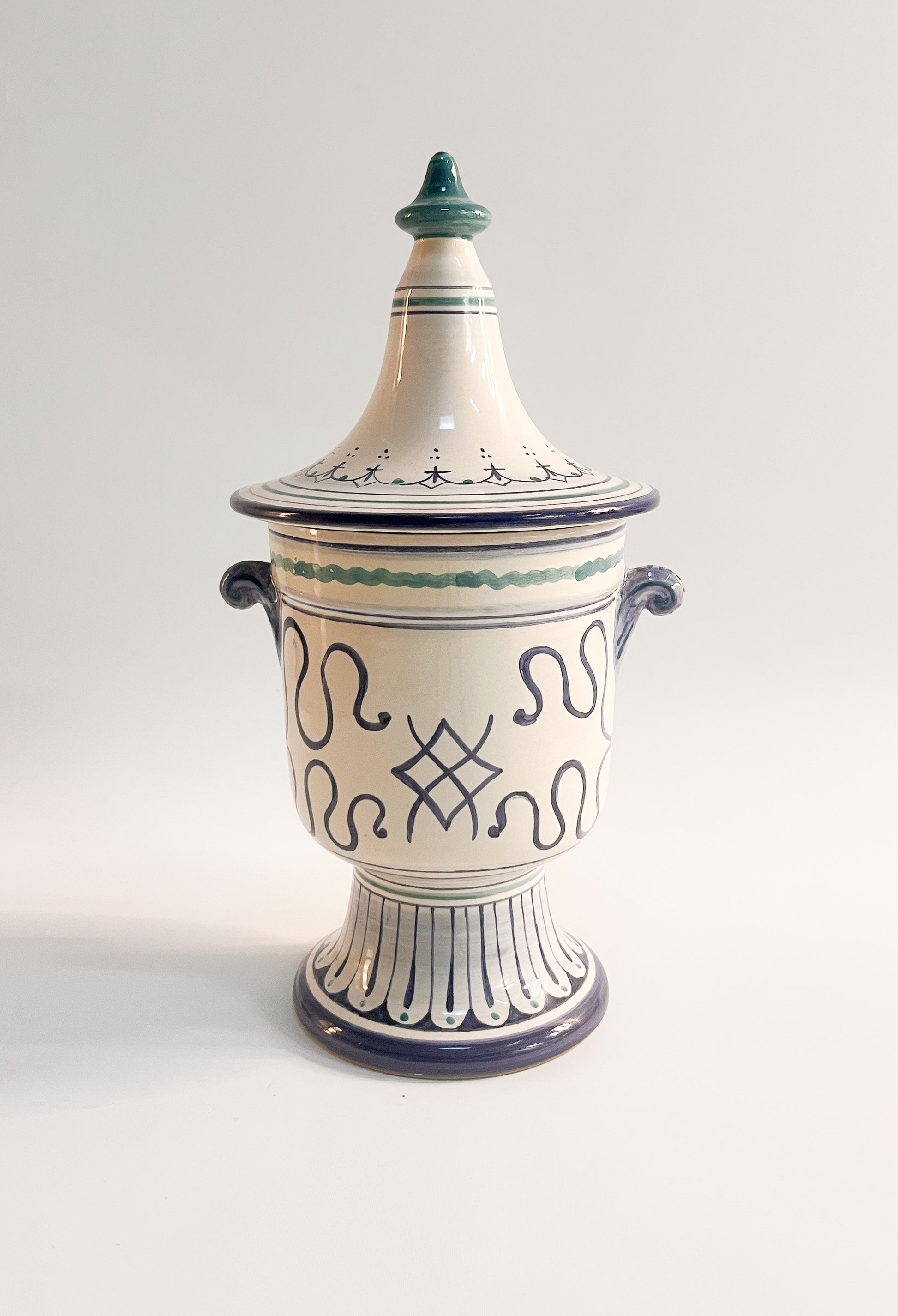 Käsin valmistettu keraaminen purkki, jossa perinteinen apteekkiestetiikka yhdistyy Derutan rikkaaseen maalausperinteeseen. Värikäs kukka‑ ja lehtiornamentiikka kehystää keskiosaa, ja sivuilla olevat pienet kahvat korostavat purkin klassista muotoa.