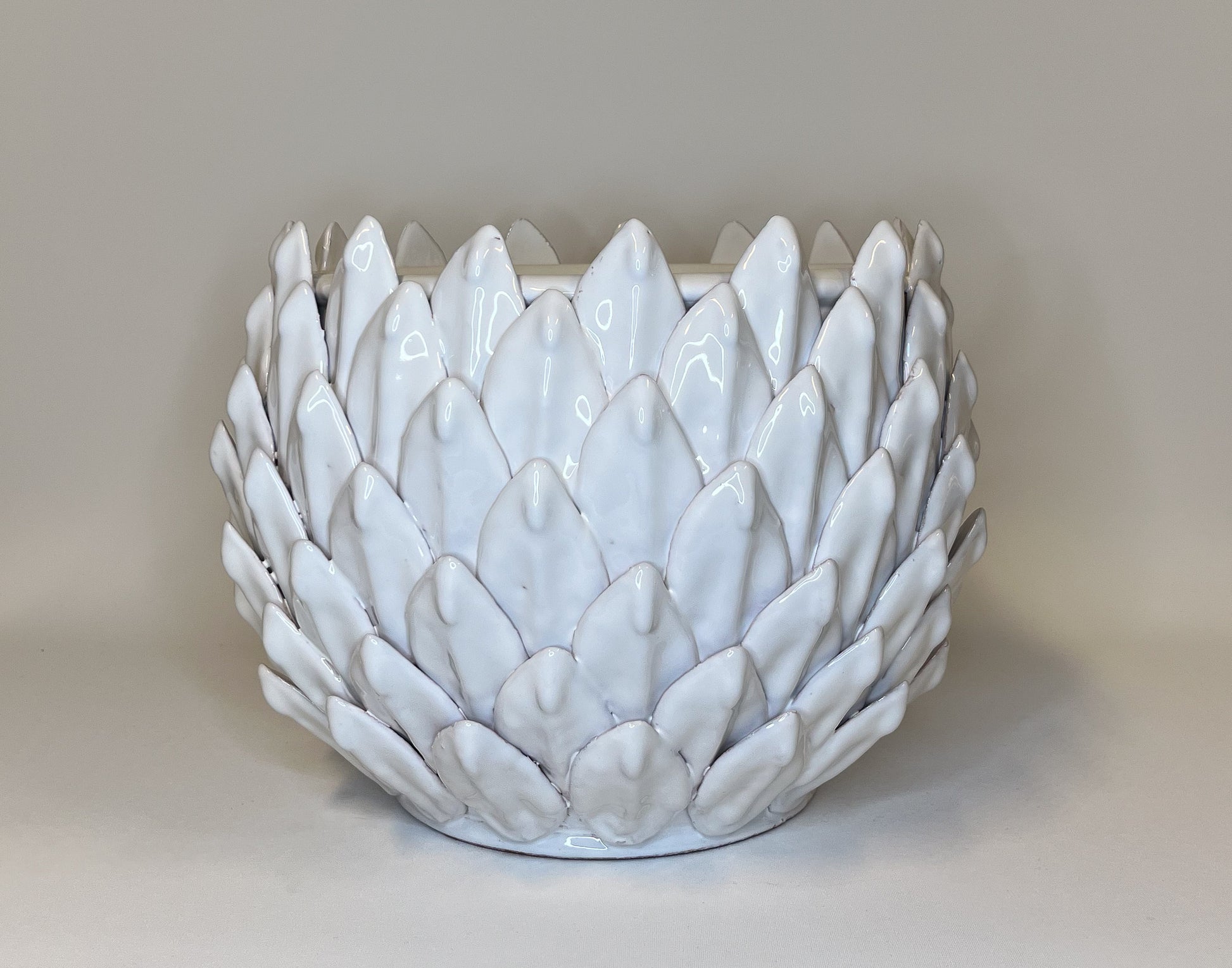 Tämä hienostunut keraaminen ruukku on muotoiltu artisokan inspiroimana, puhtauden ja Välimeren viehätyksen symbolina. Sen raikas valkoinen viimeistely tekee siitä täydellisen valinnan moderneihin, minimalistisiin sisustuksiin.