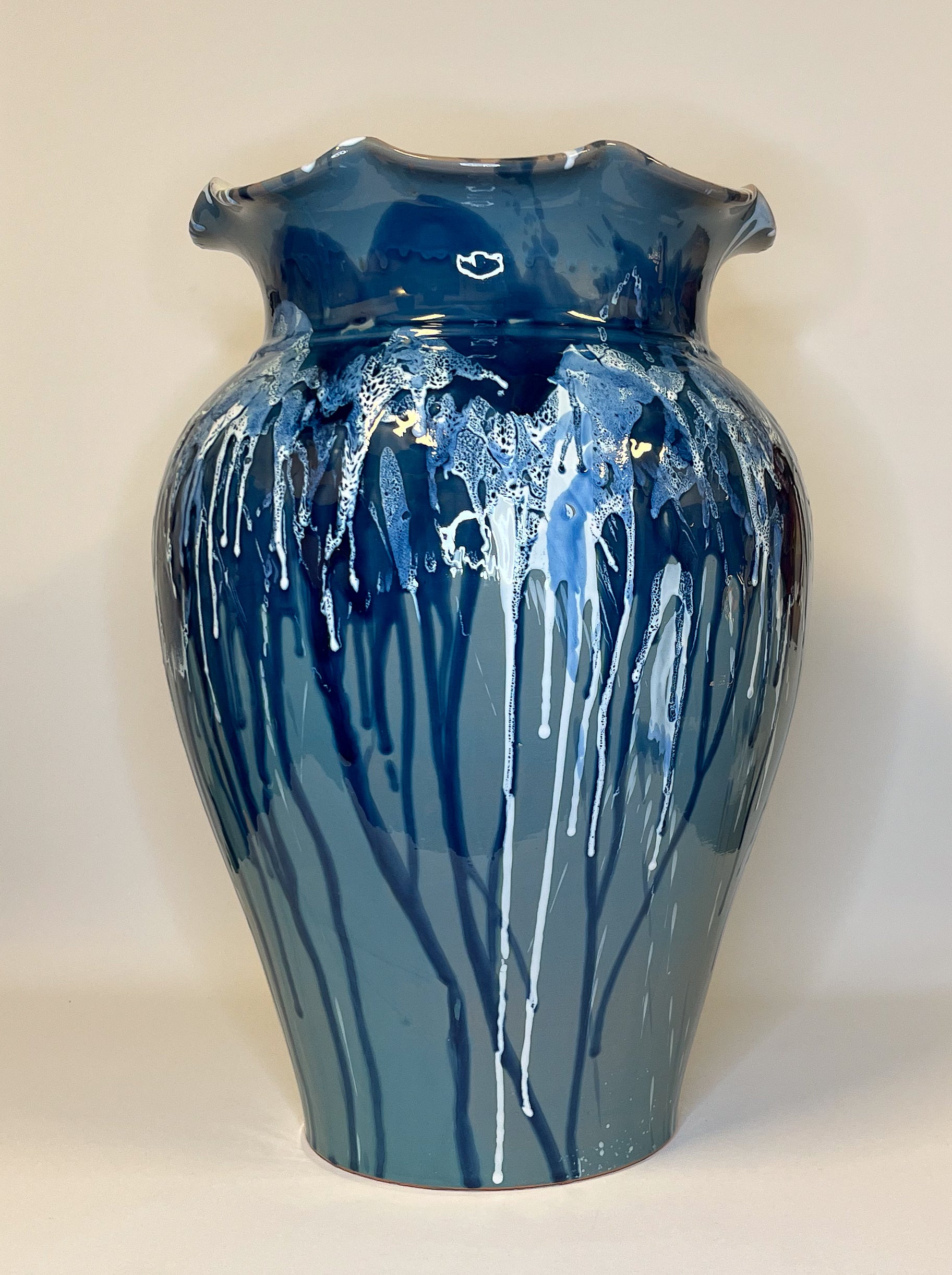 Tämä Fratantonin käsityöläisperheen valmistama keraaminen vaasi yhdistää sisilialaisen taiteen hengen moderniin viimeistelyyn. Sen sileä muoto herää eloon ilmeikkäiden sinisten sävyjen kautta, jotka luovat ainutlaatuisen kuvioinnin. Lopputulos tuo mieleen meren liikkeen ja aidon käsityön spontaaniuden.