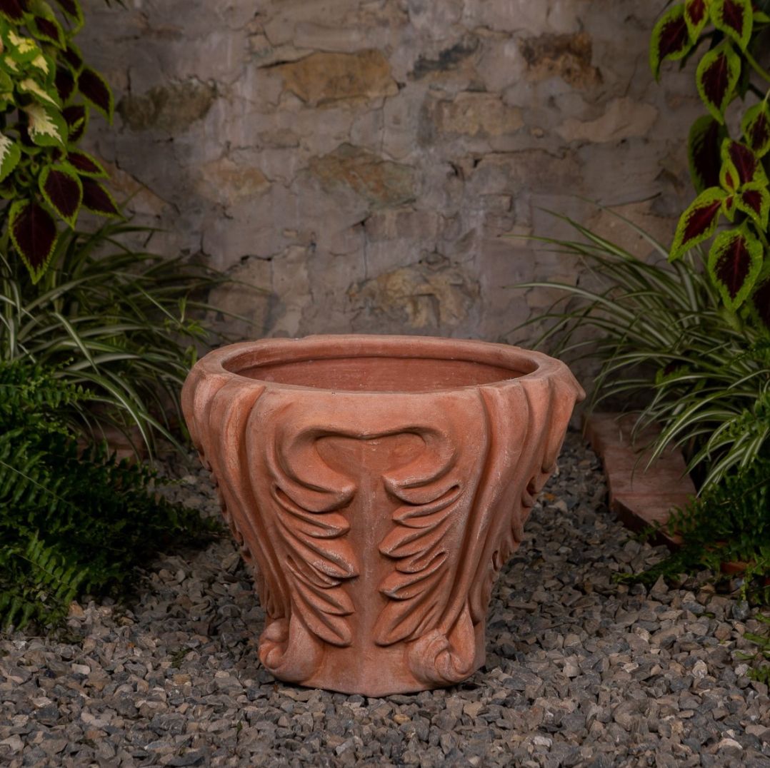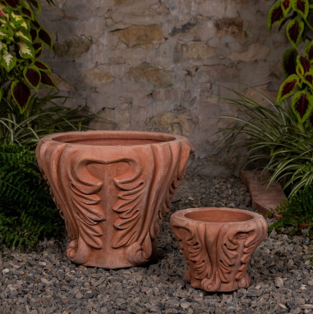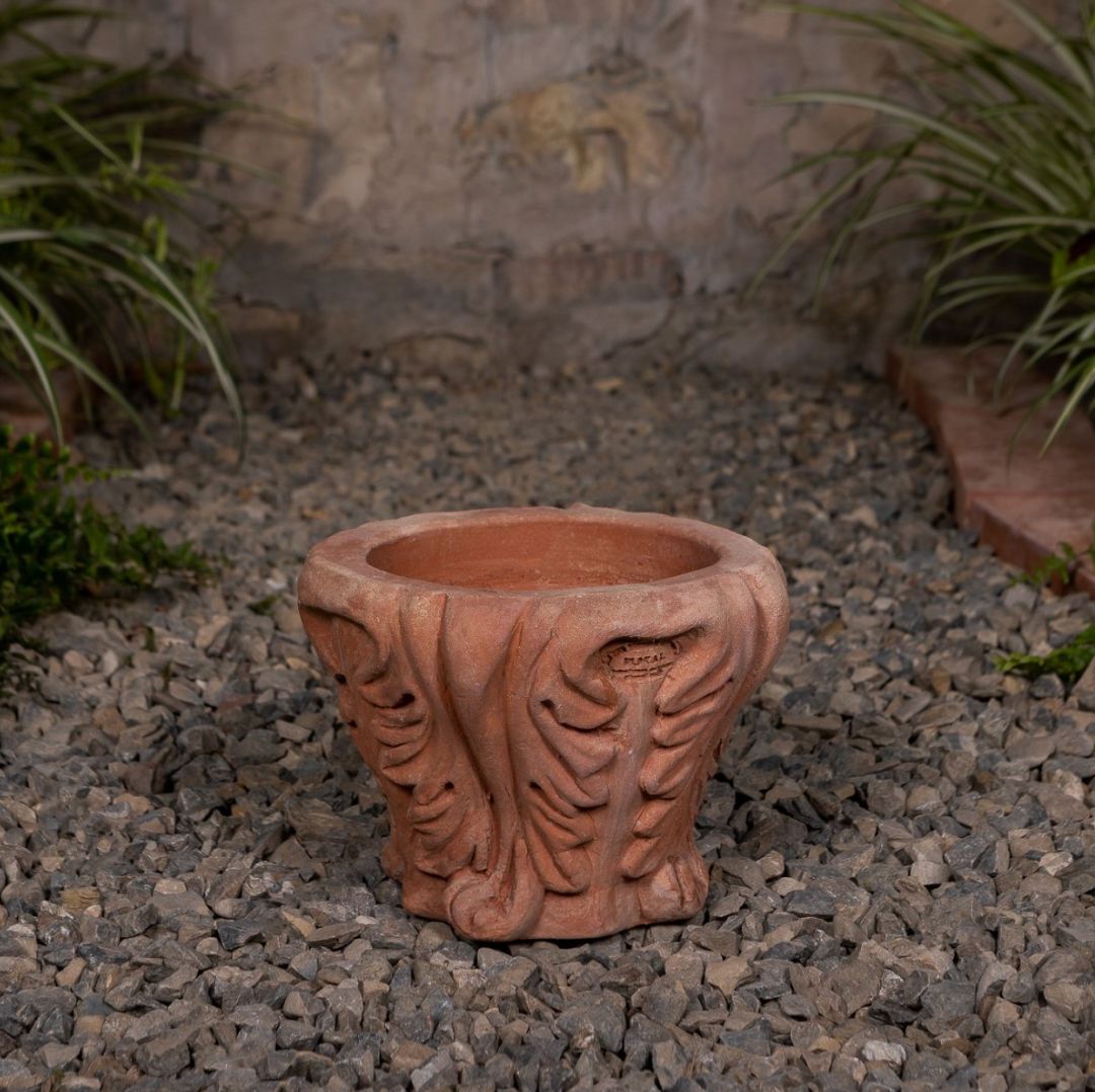 Pieni akantuslehtikuvioitu ruukku yhdistää klassisen eleganssin ja kauniit, käsin viimeistellyt yksityiskohdat. Koristeelliset akantuslehdet tuovat maljakkoon arvokkuutta, ja sen harkittu muotoilu tekee siitä näyttävän lisän mihin tahansa sisustukseen tai puutarhaan. Erinomainen pakkasenkestävyys jopa –20°C asti.