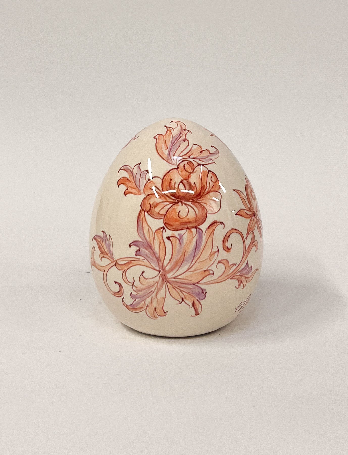 Käsin valmistettu ja taidokkaasti maalattu keraaminen koristemuna, jossa kukkiva, eläväinen kuviointi korostaa italialaista käsityöperinnettä. Pehmeät sävyt ja orgaaniset muodot luovat harmonisen kokonaisuuden, joka toimii eleganttina sisustuselementtinä hyllyllä, vitriinissä tai osana kausikoristelua.