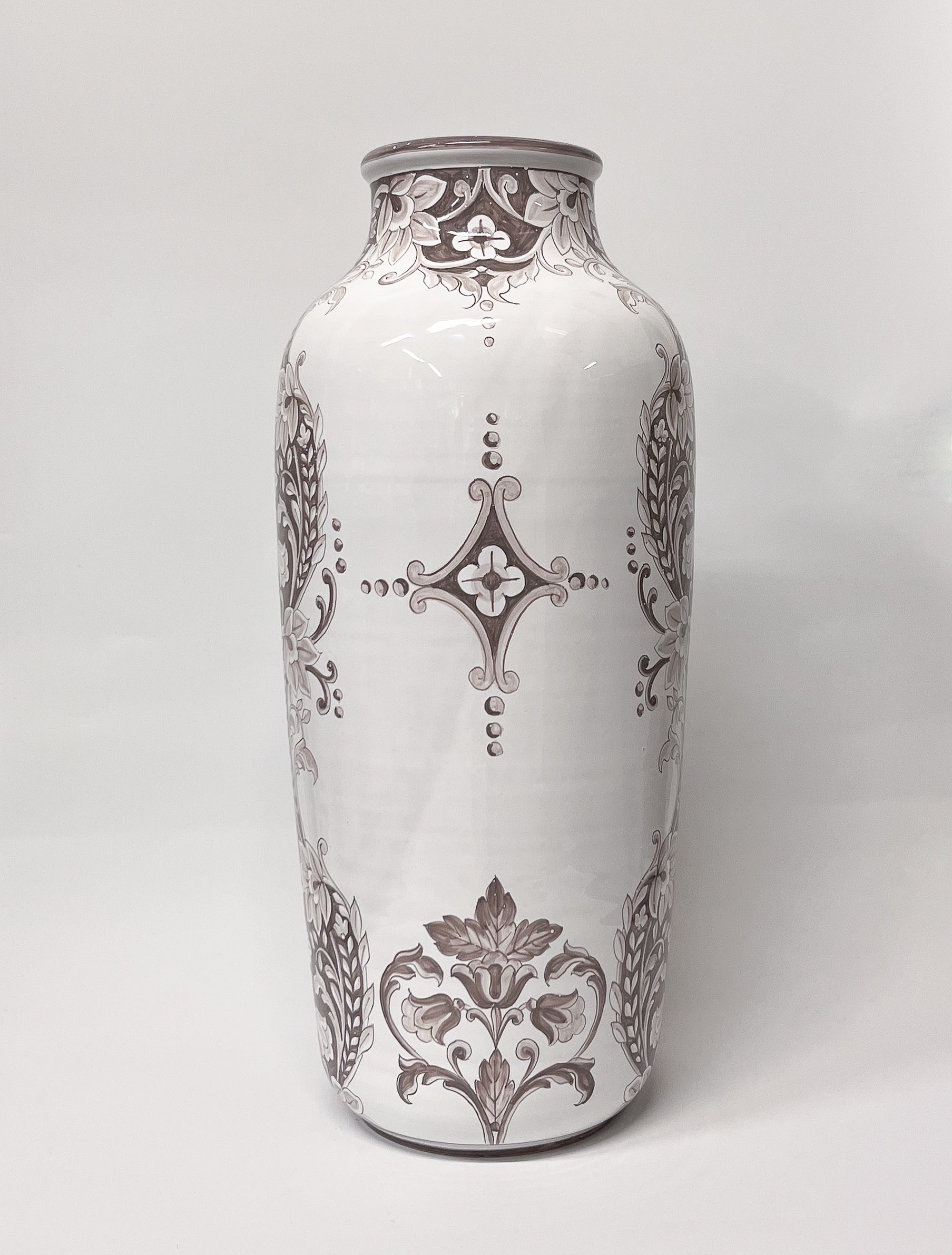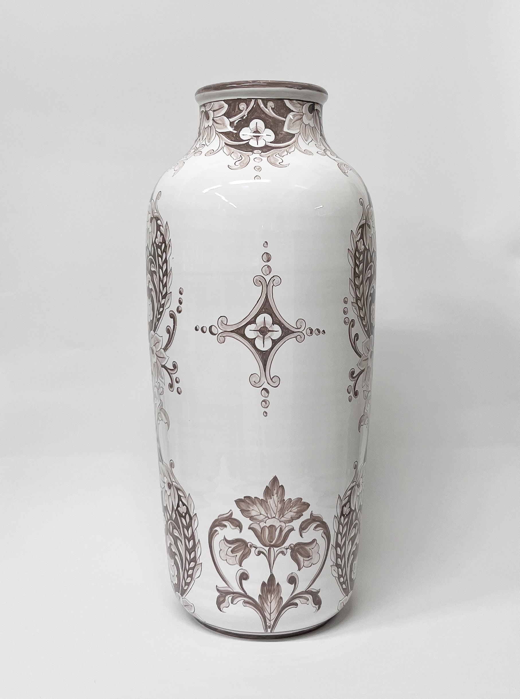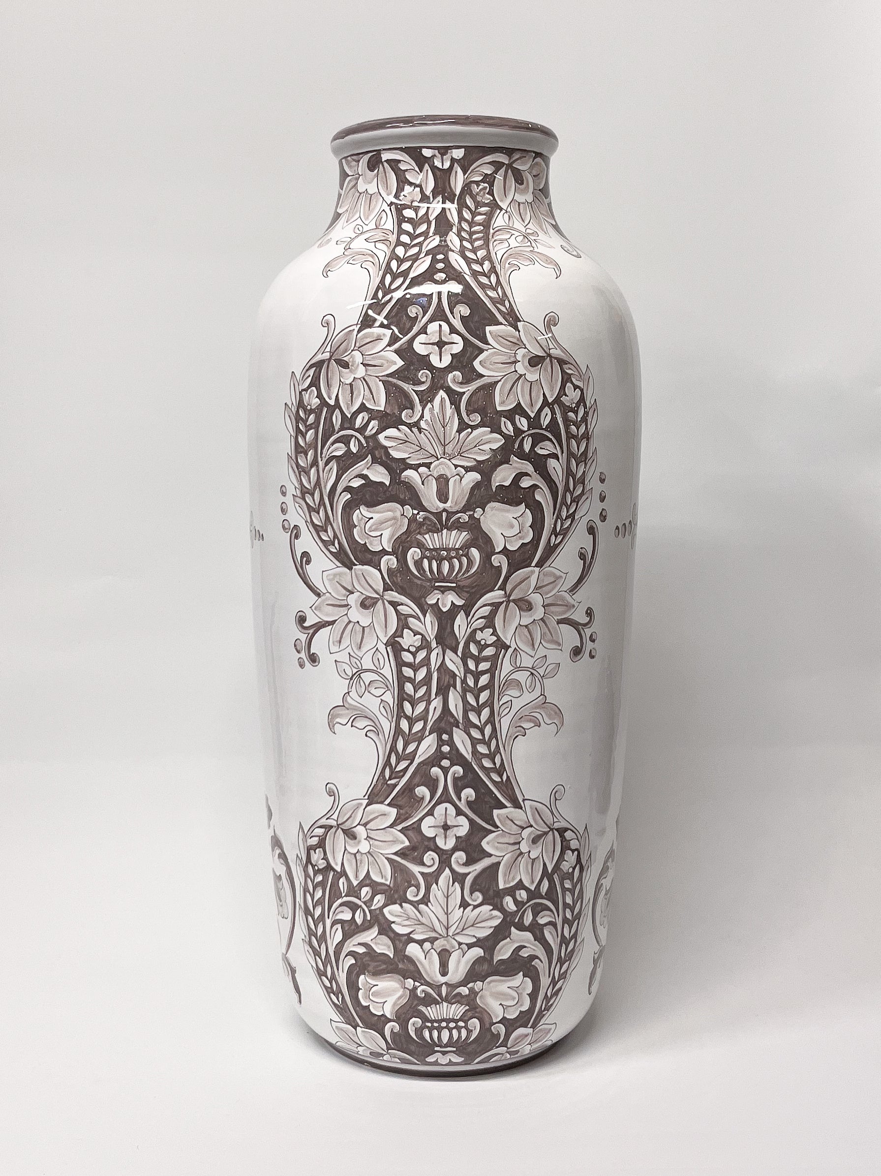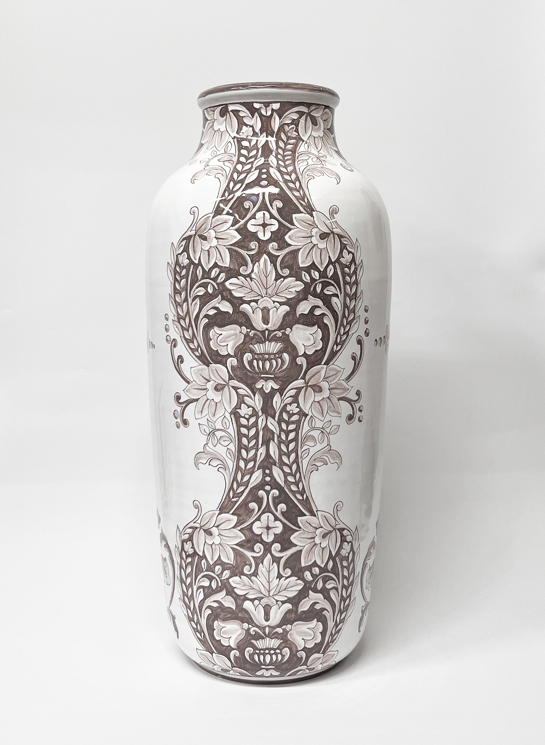 Käsin valmistettu keraaminen maljakko, jossa tumma, symmetrinen ornamentiikka korostaa Derutan perinteistä maalaustaidetta. Yksityiskohtainen kukka- ja lehtiaiheinen kuviointi luo harmonisen, pitsimäisen ilmeen, joka tuo esiin maljakon veistoksellisen muodon.