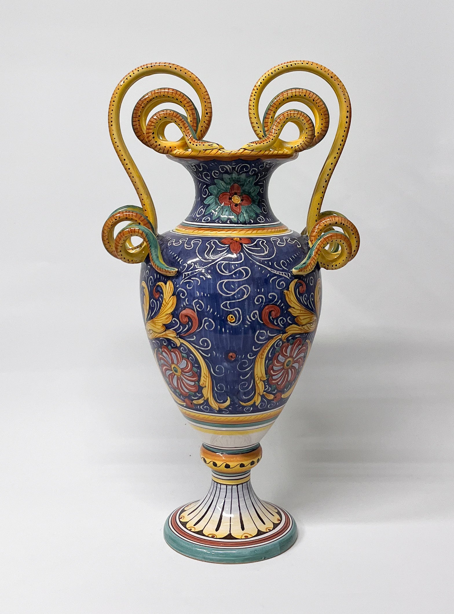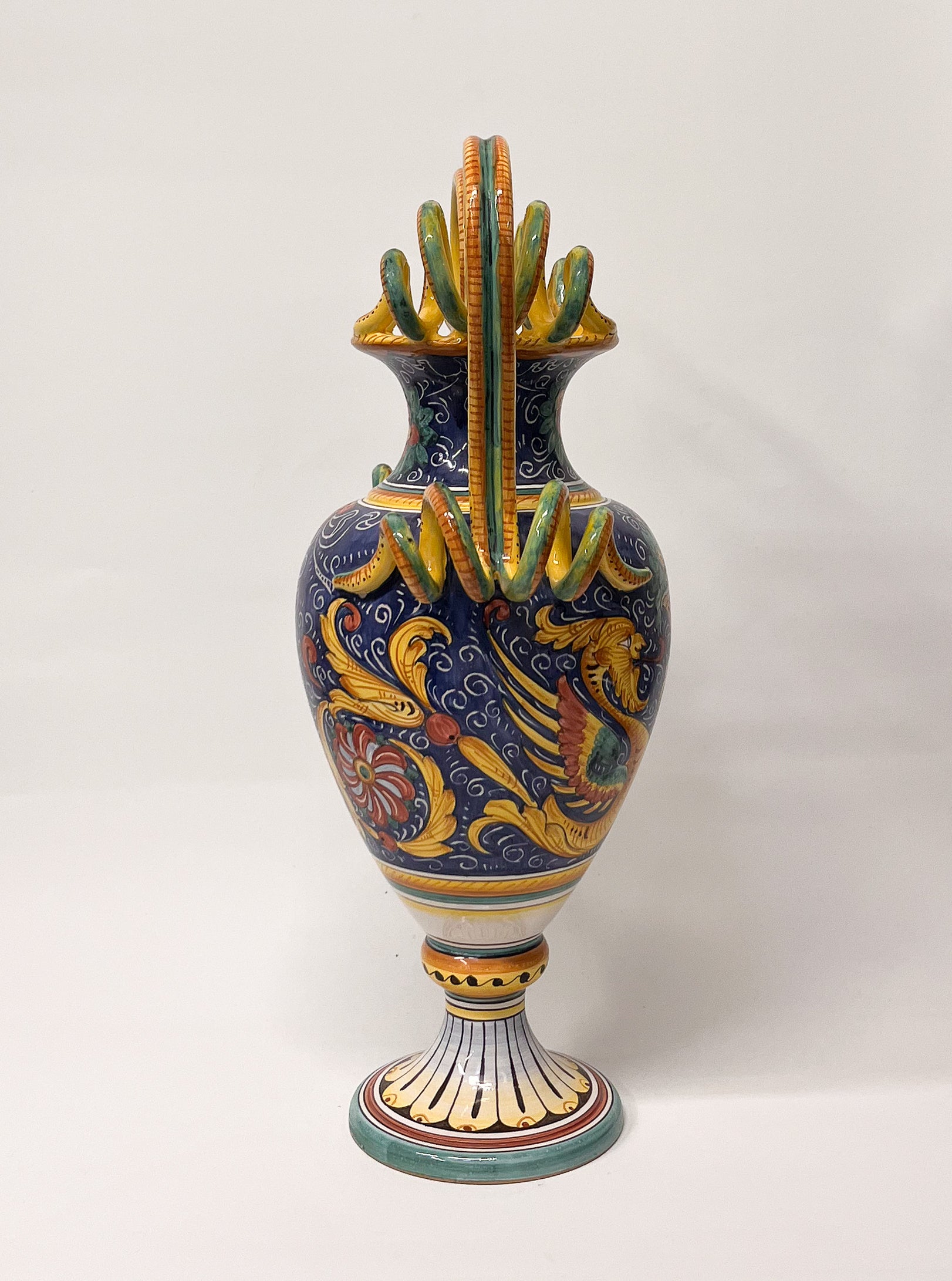 L’Antica Deruta Morettin käsin maalattu taidevaasi, jossa perinteinen derutalainen majolikka kohtaa modernin viimeistelyn. Syvä sininen pohja, tarkat yksityiskohdat ja veistokselliset kahvat tekevät tästä vaasista näyttävän, mutta tyylikkään kokonaisuuden. Laadukas, kestävä ja selvästi käsityönä tehty.