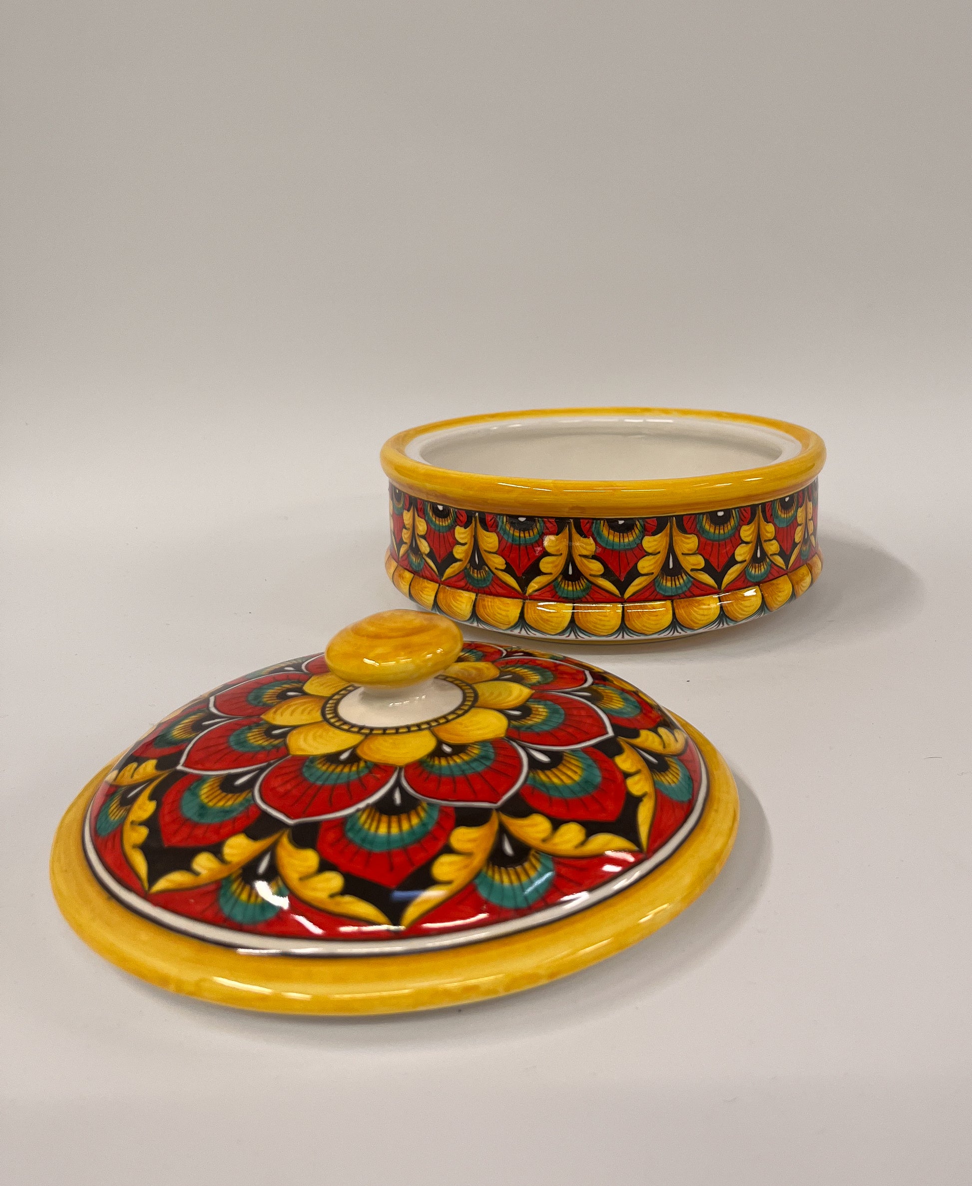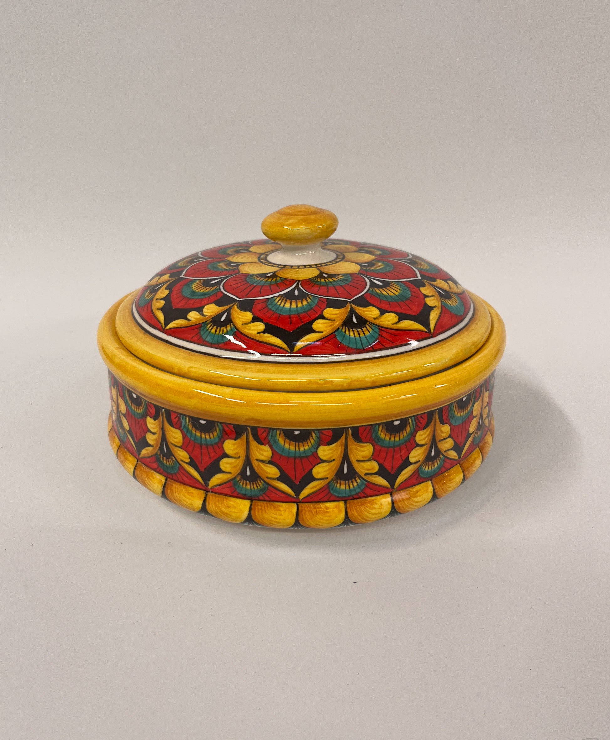 Tämä värikäs, käsinmaalattu rasia on valmistettu Derutan perinteikkäässä Sambuco Ceramichen työpajassa, jossa majolika-tekniikkaa on vaalittu sukupolvien ajan. Rasian pinnalla toistuvat symmetriset kukka- ja lehväaiheet, jotka on maalattu vapaalla kädellä kirkkailla sävyillä: punaisella, keltaisella, vihreällä ja mustalla. Kannellinen muoto tekee siitä sekä koristeellisen että käytännöllisen, ja kiiltävä keltainen reunus tuo esineeseen lämpöä ja kontrastia. Tämä koristerasia sopii erinomaisesti osaksi sisustusta, jossa arvostetaan italialaista käsityöperinnettä ja elävää värimaailmaa.