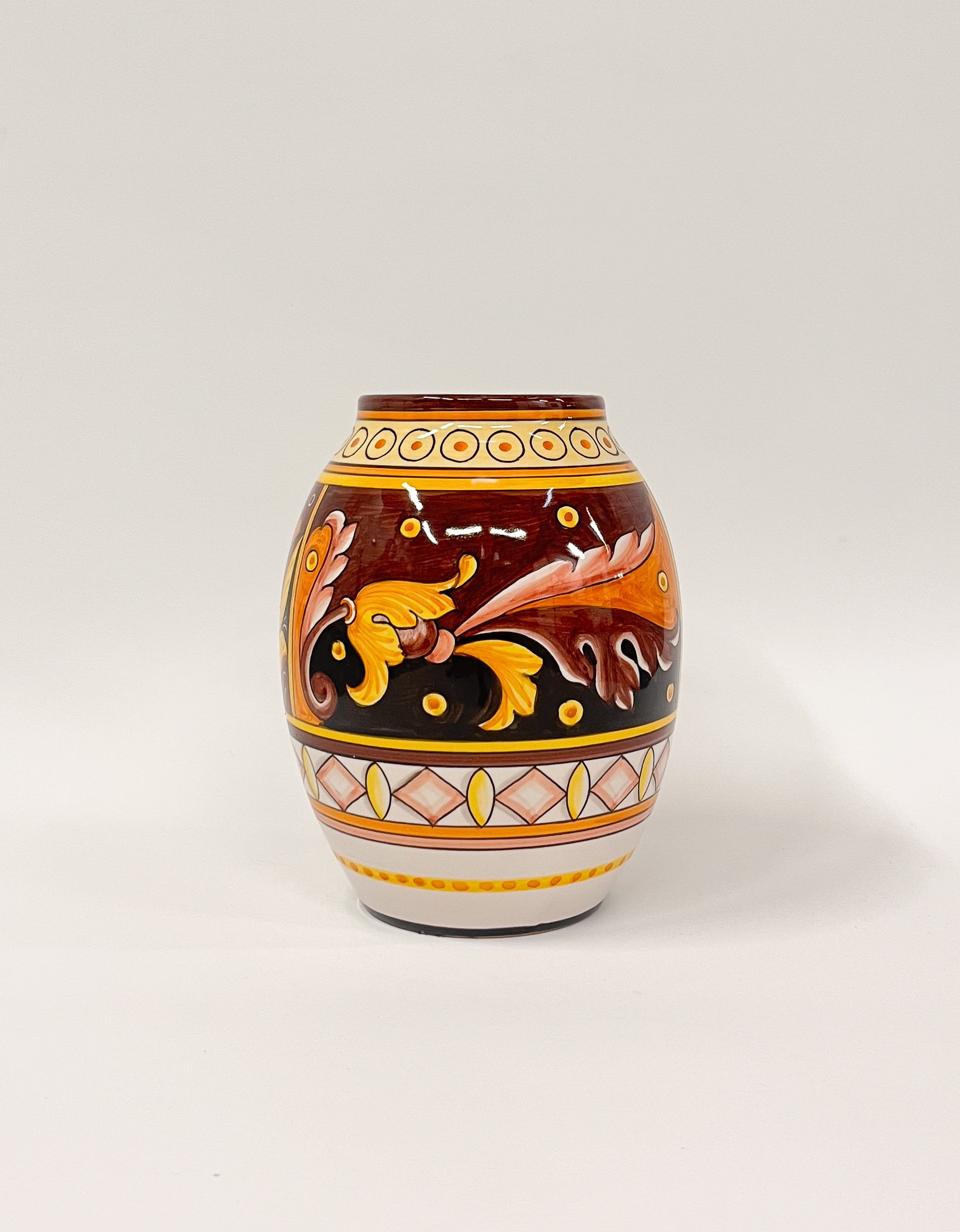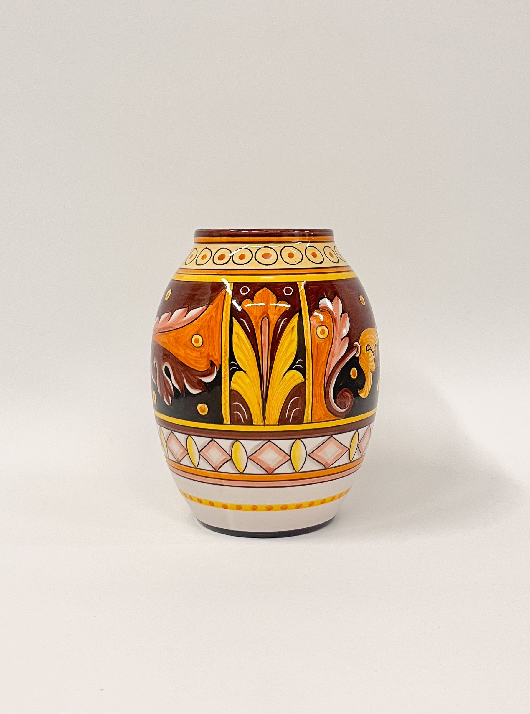 Tämä käsinmaalattu maljakko on valmistettu Derutan arvostetussa Sambuco Ceramichen työpajassa, jossa majolika-tekniikkaa on vaalittu sukupolvien ajan. Maljakon pinta jakautuu kolmeen vyöhykkeeseen: yläosan ympyräornamentit, keskiosan lehväkuviot sekä alaosan timanttimuotoiset sommitelmat muodostavat harmonisen kokonaisuuden. Sävymaailma – keltainen, oranssi, ruskea, musta ja valkoinen – tuo esineeseen lämpöä ja klassista italialaista estetiikkaa. Symmetrinen koristelu ja huolellinen sivellintyö tekevät tästä maljakosta näyttävän sisustuselementin.