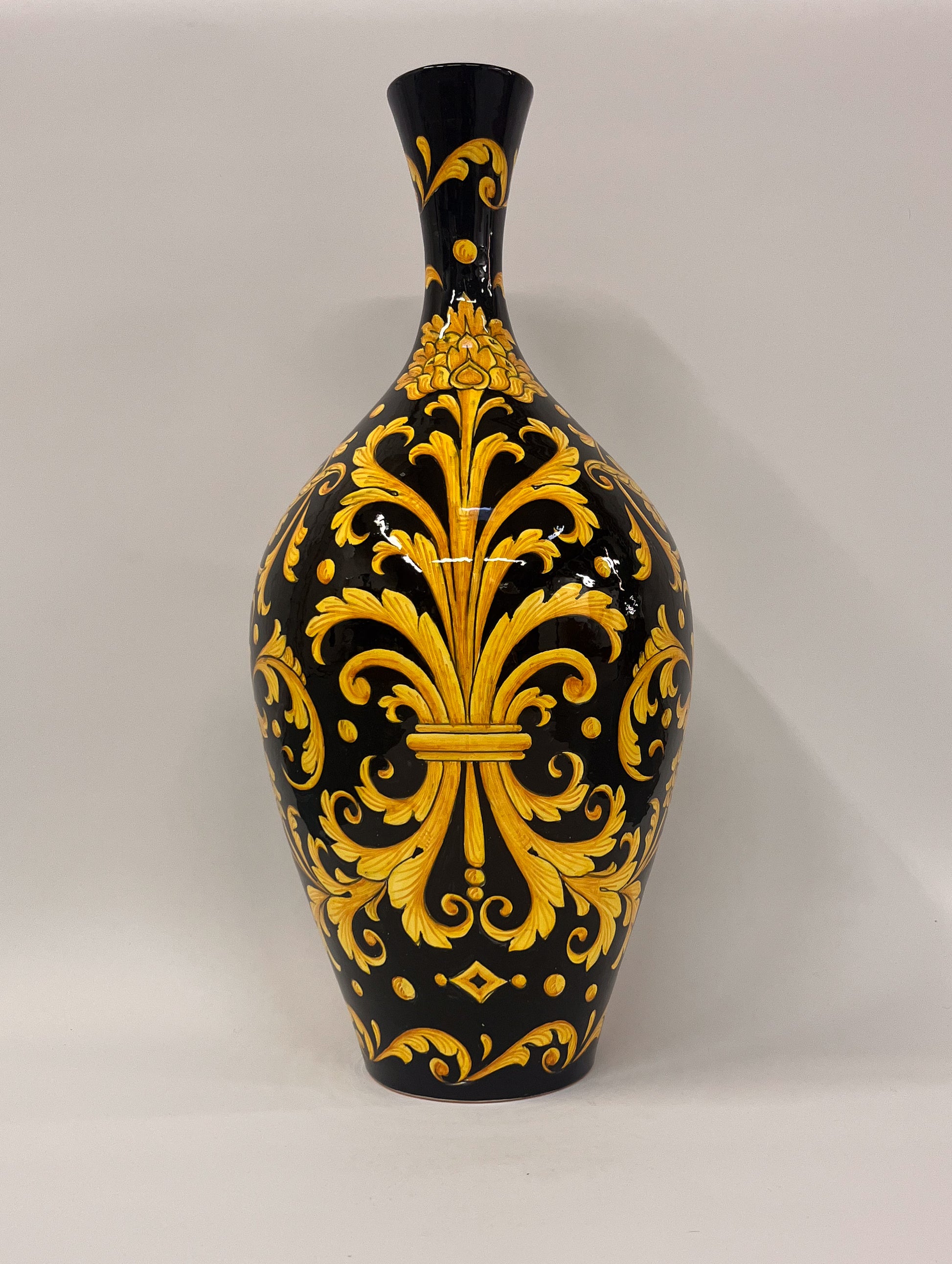 Tämä elegantti, korkeaprofiilinen maljakko on valmistettu Derutan arvostetussa Sambuco Ceramichen työpajassa, joka tunnetaan majolika‑tekniikan huippuosaamisesta. Mustalle lasitteelle maalatut keltaiset kukka‑ ja lehväornamentit on toteutettu vapaalla kädellä, ja ne peittävät maljakon pinnan symmetrisesti ja tarkasti. Maljakon muoto on klassinen ja koristeellinen, ja sen yksityiskohdat heijastavat Derutan keramiikkaperinteen taiteellista syvyyttä.