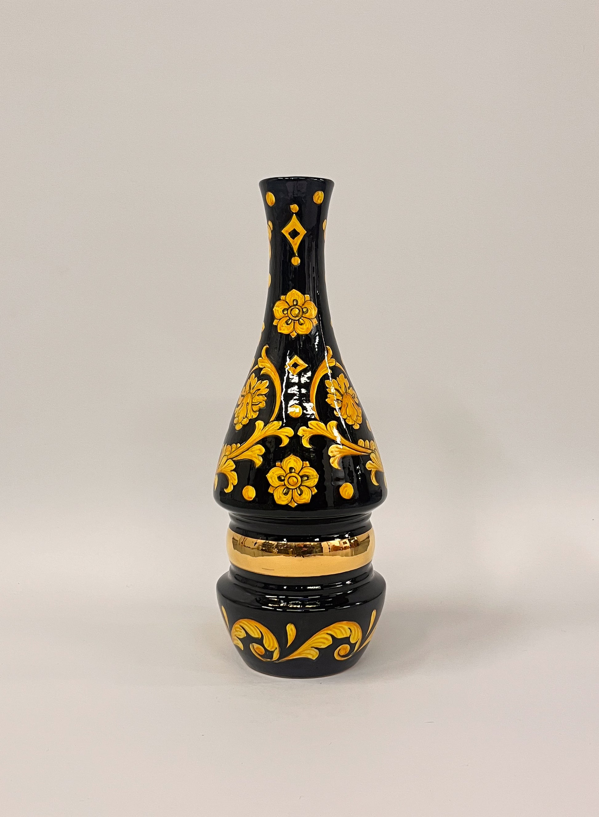 Tämä käsinmaalattu maljakko on valmistettu Derutan arvostetussa Sambuco Ceramichen työpajassa, jossa majolika ‑perinnettä on vaalittu sukupolvien ajan. Mustalle lasitteelle toteutetut keltaiset kukkaornamentit on maalattu vapaalla kädellä, ja maljakon keskiosaa kiertää kiiltävä kultavyö, joka on viimeistelty aidolla kullalla. Symmetrinen muoto, koristeiden tarkkuus ja materiaalien laatu tekevät tästä esineestä arvokkaan sisustuselementin, joka yhdistää italialaisen käsityötaidon ja ajattoman estetiikan.
