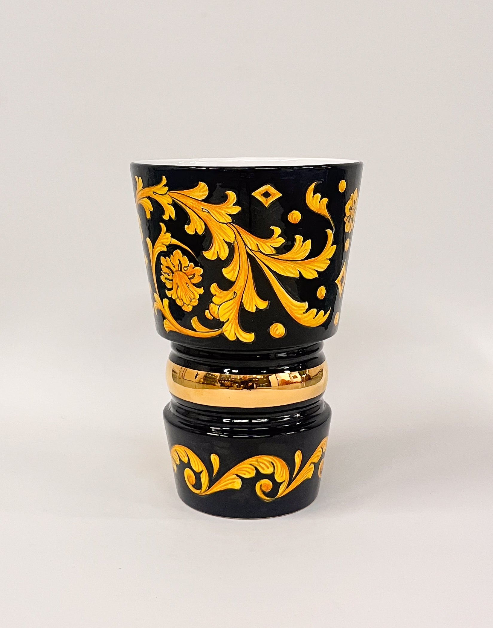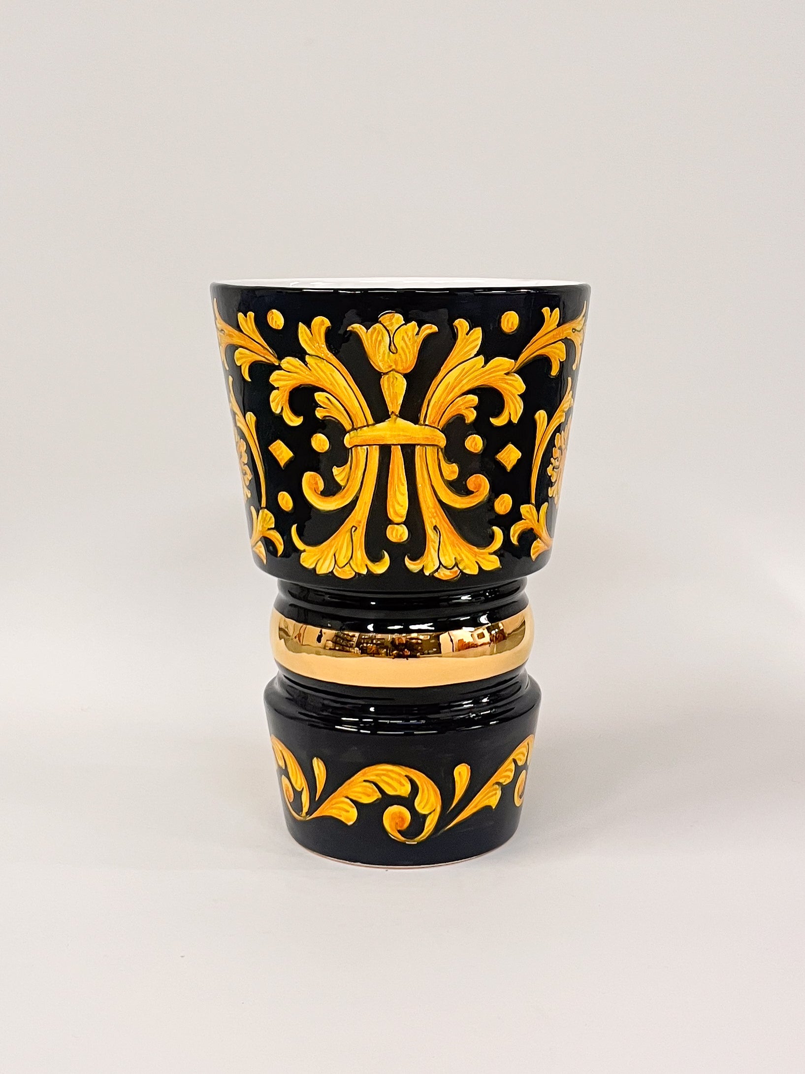 Tämä käsinmaalattu maljakko edustaa Derutan majolika ‑perinteen hienostuneinta osaamista. Mustalle lasitteelle toteutetut keltaiset kukka‑ ja ornamenttikuviot on maalattu vapaalla kädellä, ja maljakon keskiosaa kiertää kultakoritelu. Symmetrinen muoto, koristeiden tarkkuus ja materiaalien laatu tekevät tästä esineestä arvokkaan sisustuselementin, joka yhdistää italialaisen käsityötaidon ja ajattoman estetiikan.