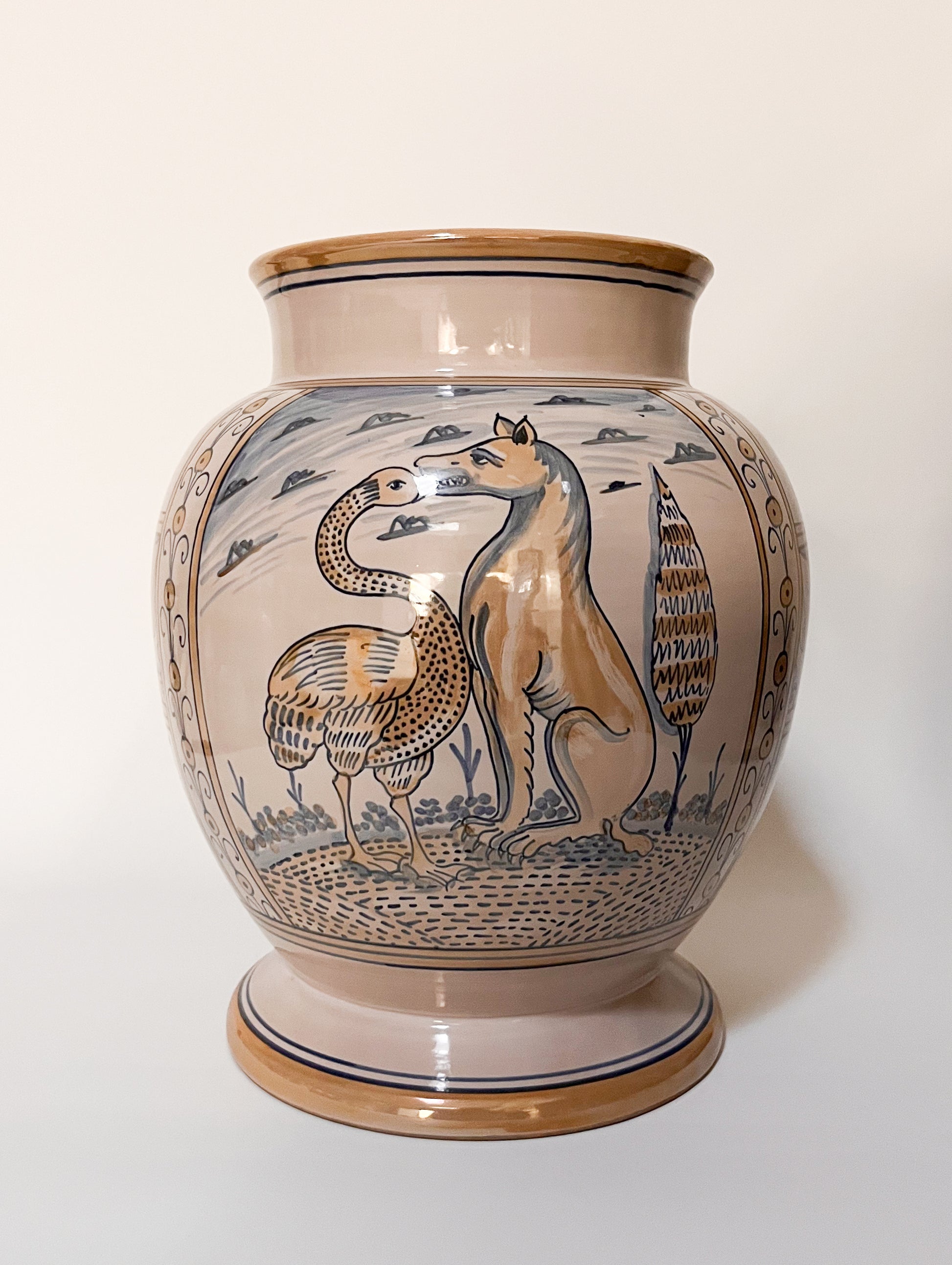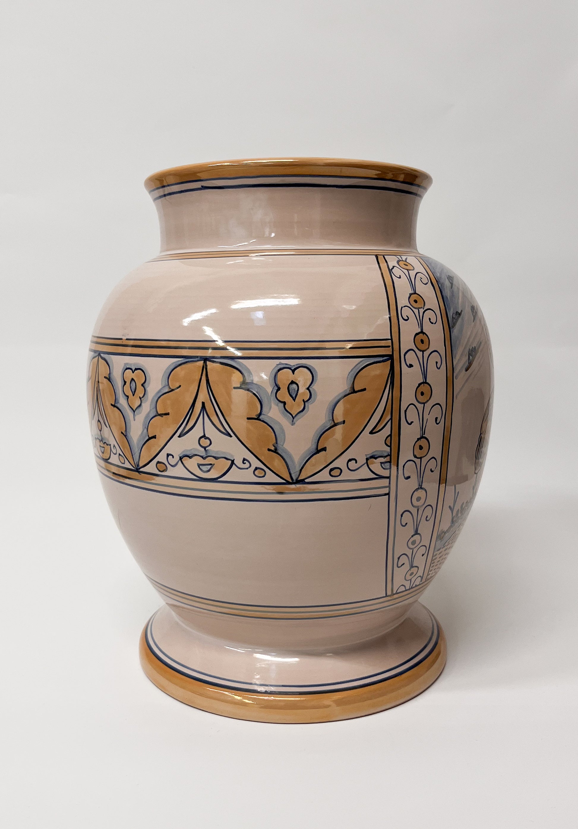 Käsin valmistettu keraaminen maljakko, jossa perinteinen kuvamaalaus herää eloon hienovaraisissa sävyissä. Tämä maljakko on enemmän kuin koriste-esine: se kantaa mukanaan tarinallisuutta, symboliikkaa ja Derutan mestareiden käsityöperinnettä, tuoden sisustukseen lämpöä ja kulttuurista syvyyttä.