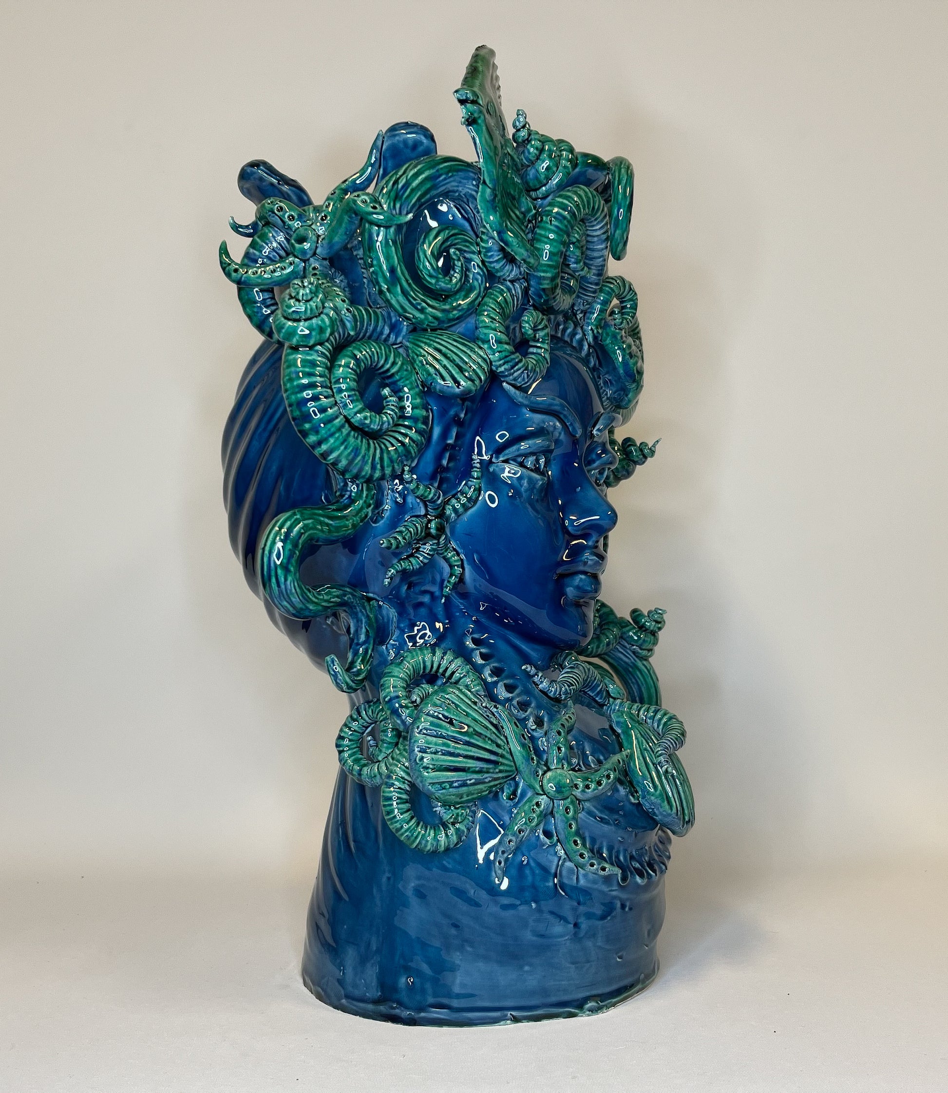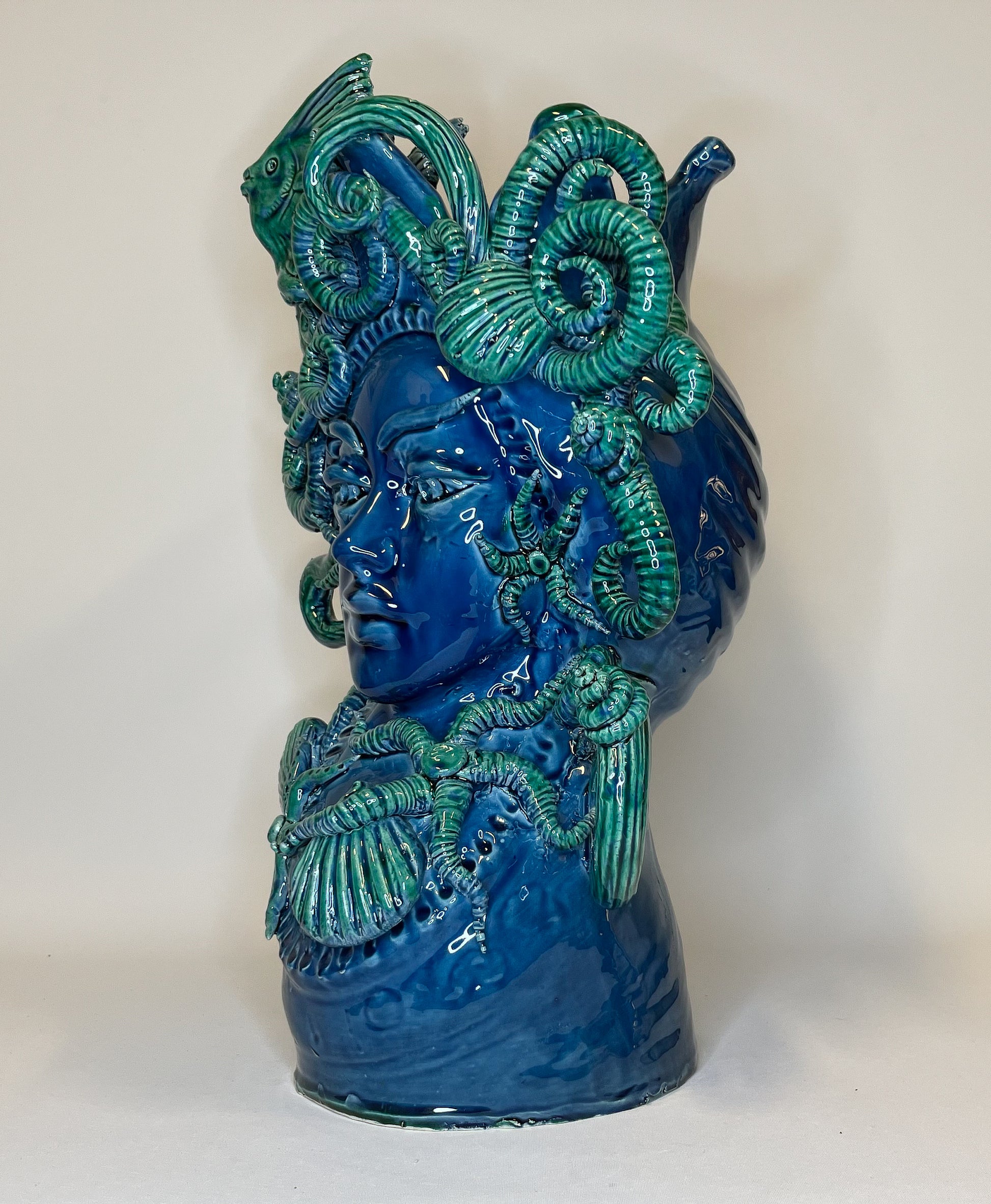 Lighea on meren muusa ja salaperäisyyden kantaja, joka herää eloon tässä kiehtovassa keraamisessa vaasissa. Hänen rauhallinen katseensa ja virtaavat, merestä inspiroituneet koristeaiheet luovat harmoniaa, syvyyttä ja Välimeren legendaarista viehätystä.