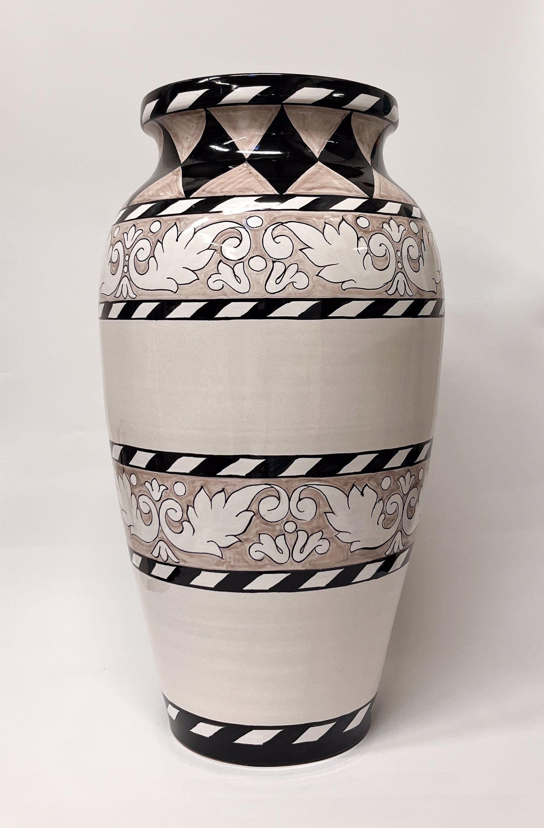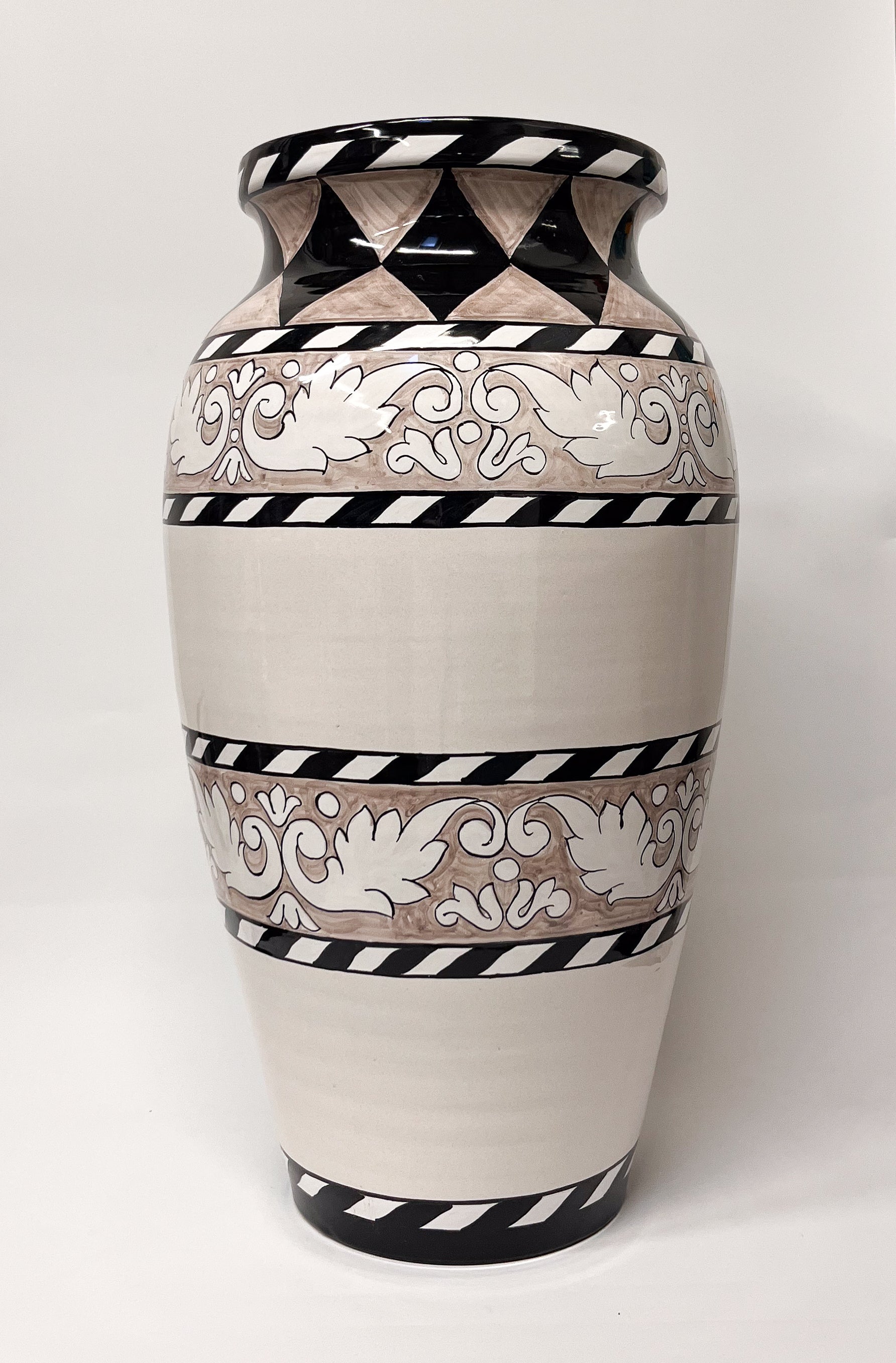 L’Antica Deruta Morettin käsin maalattu vaasi, jossa beige‑musta värimaailma ja tarkka koristekuviointi korostavat perinteistä keramiikkakäsityötä. Muoto on selkeä ja viimeistely huolellinen. Jokainen kappale on yksilöllinen: käsinmaalauksen pienet vaihtelut ja epäsymmetriat kuuluvat aidon käsityön luonteeseen ja tekevät vaasista uniikin. Näyttävä ja laadukas sisustuselementti, joka toimii sekä yksinään että osana kokonaisuutta.